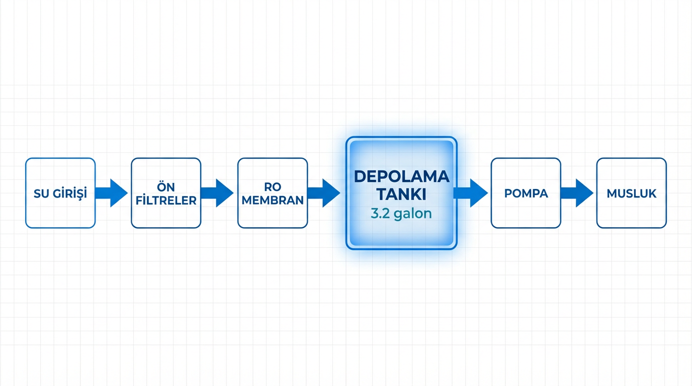 Bu sistemde su, kullanım anında üretilmez; önceden üretilip tankta depolanır. Kullanıcı musluk açtığında hazır su alır.