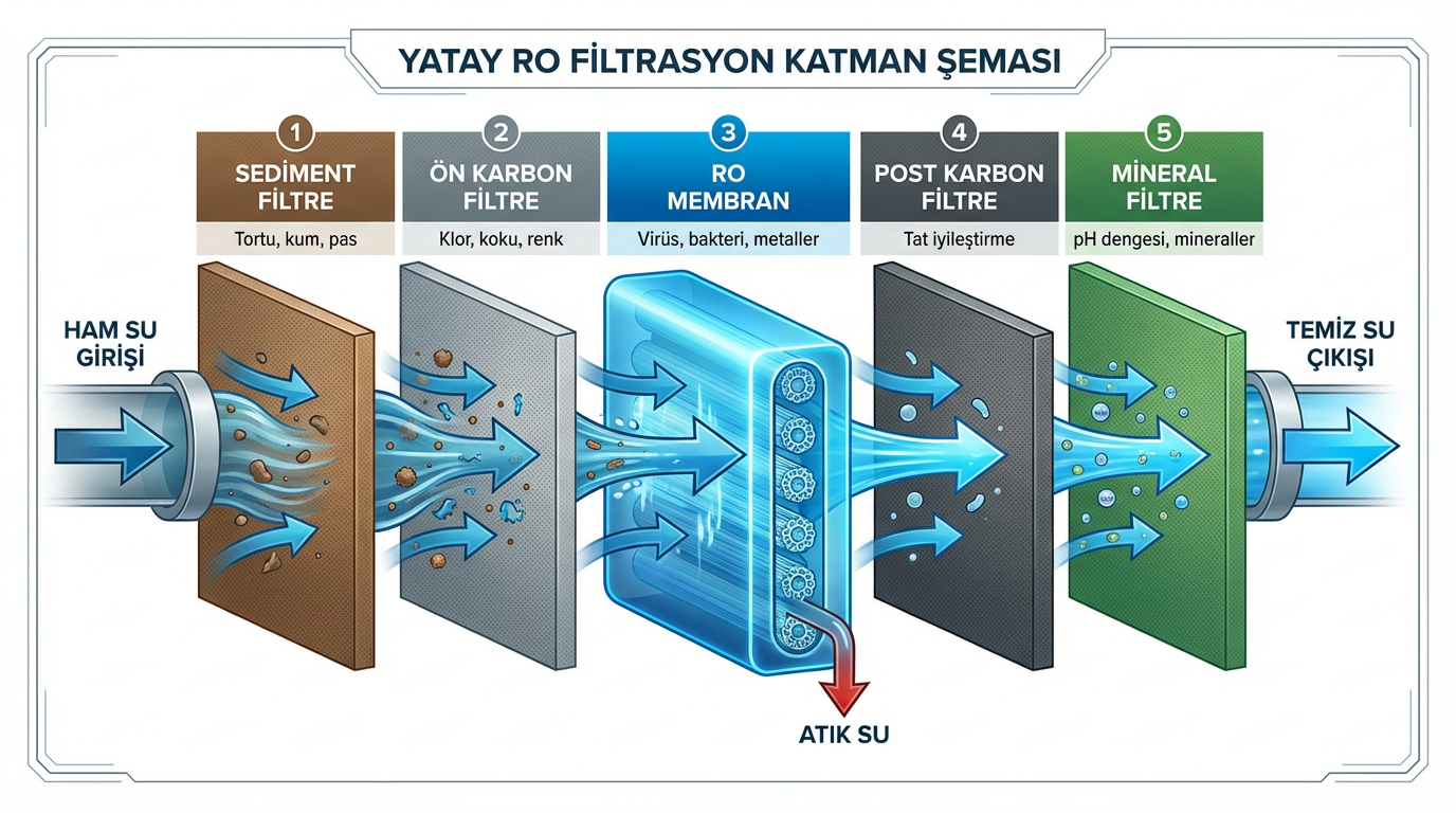 5. AşamaMineral filtre (opsiyonel)Mineral ekleme— (mineral ekler, tutmaz)